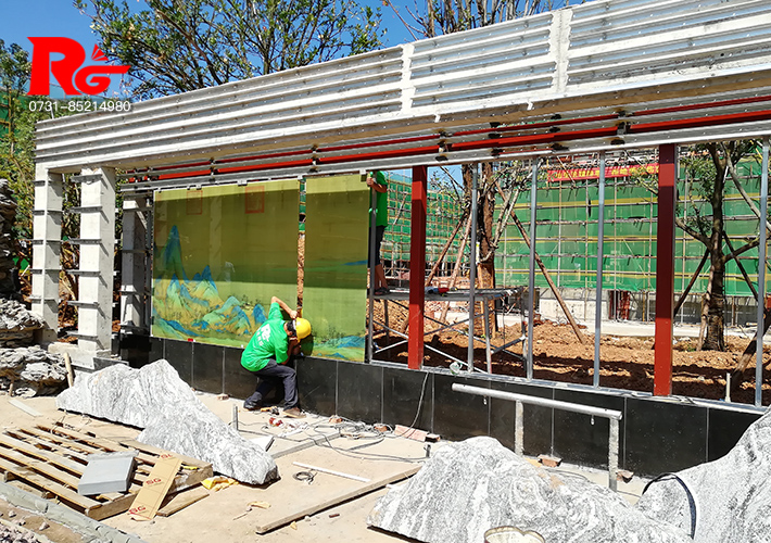 燈箱采用玻璃材質,通過高清UV畫面“千里江山圖”,整體施工對細節的要求比較高,同時需要解決戶外潮氣凝聚影響畫面效果的問題,以及蚊蟲進入燈箱等等問題。